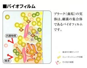 食べかすが細菌の作用を受けて変質して歯の表面に固着したものがプラーク(歯垢)です。いわばプラークは細菌のかたまりのようなものです。バイフィルムとは歯の表面を覆う細菌の膜のことです。これをしっかり取り除くことがブラッシングの目的です。ただなんとなくブラシを動かしていただけではバイオフィルムは取り除けません。歯科衛生士から的確なブラッシング法を学んでください。