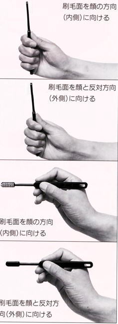 まずパームグリップは右の図の上二つのように手の平で握るようにして持ちます。これは主に毛のわき腹を使う方法で、持ちやすい反面ブラシ圧が必要以上に強くなる傾向があります。