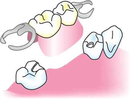 歯を失った後はそれが親知らず(智歯)や過剰歯(本来余分に生えていた歯)や転移歯(歯列から外れて生えていた歯)などを除いて原則的に人工の歯を入れなければなりません。歯の補い方(補綴=ホテツといいます)には大きく分けると、1)取り外しのできるもの(これを義歯=ギシといいます)、2)残っている歯に固定してしまうもの(これがブリッジです)、3)欠損した部位の骨の中に人工的な歯根を植える方法(インプラント)の3つになります。