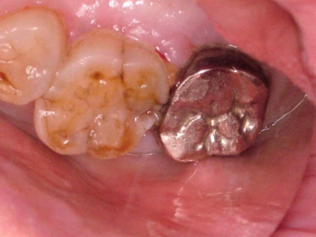 写真で左の歯(上顎第一大臼歯)が右の金属冠に接するところで隣接面う蝕になっています。