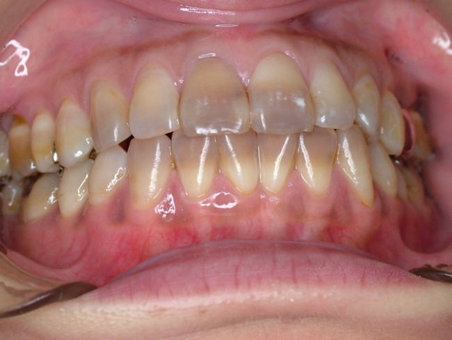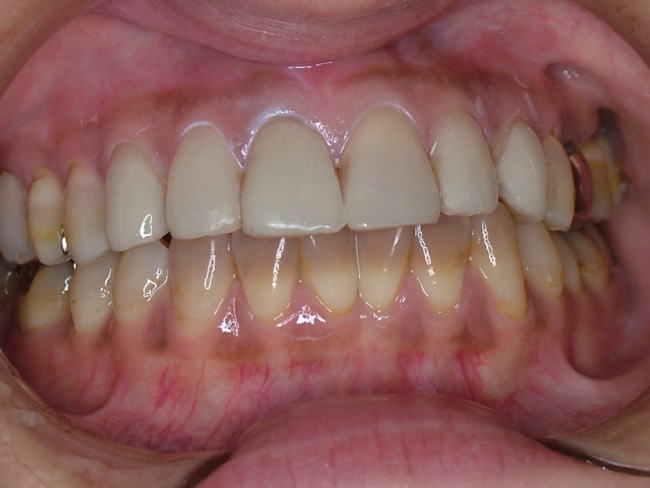 最近の当院での症例をご紹介します。この患者様は変色が全部の歯に及んでいるため、長期的治療が必要で、ここにご紹介するのは上顎前歯の6本を回復させた所です。