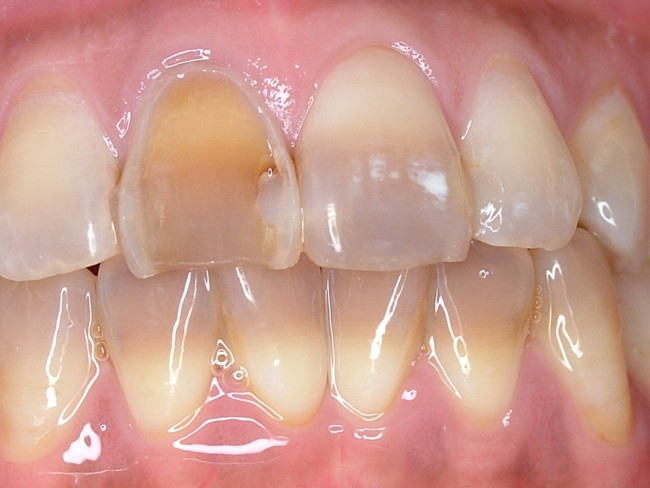歯牙表面に着色物質などが付着して変色した歯ではなく、歯の深部内面から表面まで歯質が変色している場合は、表面のエナメル質を少し削除して、歯牙接着性の樹脂(光重合レジン)を接着させて回復を図ります。