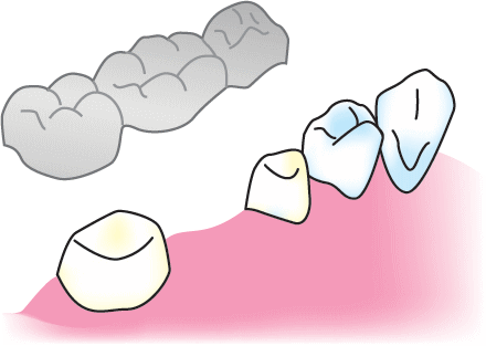 ブリッジは多くの場合抜けた歯のお隣の歯にかぶせ物をしてつなげます。1本失った場合はその前後の歯を1本ずつ使って3本分のかぶせ物になります。かぶせるためには隣りの歯を削らなくてはなりませんが、最近では接着技術や材料が進歩してきているため、以前ほど削らずにかぶせることができるようになりました。