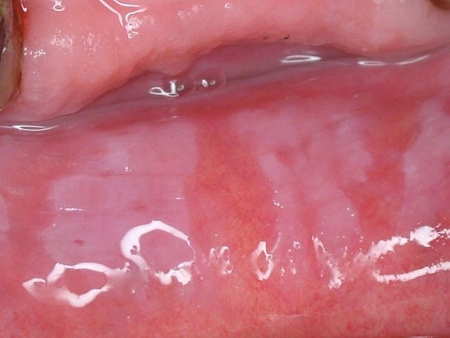 頬粘膜をはじめ口唇、舌、歯肉、口腔底粘膜などに発現する”摩擦によって除去できない”白斑病変。下の写真は口唇に発現した白板症(同一写真)です。口腔粘膜疾患としては比較的頻度が高く、単発で生じることも、また写真のように広範囲に生じることもあります。表面は粗いもの、丘陵上のもの、乳頭状のもの、また境界が限局性のもの、びまん性のものなど様々な病態を示します。状態によっては前癌病変としての性格を持つものもあります。