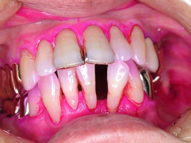 下顎前歯部の重度歯周病による歯槽骨吸収と歯根露出