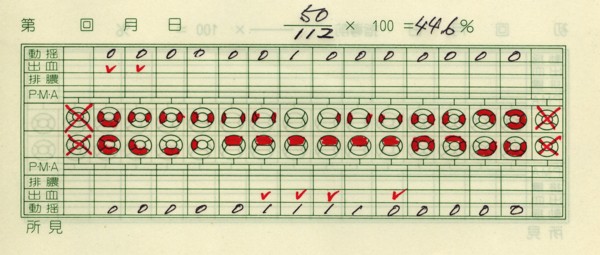 今やテレビのコマーシャルでも使われるようになった言葉です。ブラッシングや糖分制限などのさまざまな努力によってプラーク(歯垢)を歯面やポケット内部に付着させないようにすることを言います。プラークコントロールがよく出来ている、ということは歯垢の沈着が見られないことです。プラークコントロールの成績を記録するのにプラークチャートというものを使います。そして成績はパーセントで表します。右の図は当院で使っているプラークチャートです。