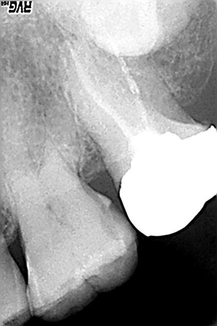 写真で左の歯(上顎第一大臼歯)が右の金属冠に接するところで隣接面う蝕になっています。